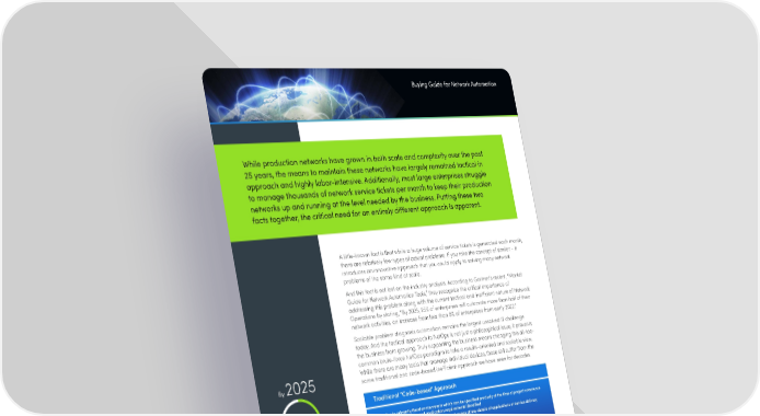 Buying Guide for Network Automation While production networks have grown in both scale and complexity over the past 25 years, the means to maintain these networks have largely remained tactical in approach and highly labor-intensive. Additionally, most large enterprises struggle to manage thousands of network service tickets per month to keep their production networks up and running at the level needed by the business. Putting these two facts together, the critical need for an entirely different approach is apparent. A little-known fact is that while a huge volume of service tickets is generated each month, there are relatively few types of actual problems. If you take the concept of similar – it introduces an innovative approach that you could apply to solving many network problems of the same kind at scale. And this fact is not lost on the industry analysts. According to Gartner’s recent, “Market Guide for Network Automation Tools,” they recognize the critical importance of addressing this problem along with the current tactical and inefficient nature of Network Operations by stating, “By 2025, 25% of enterprises will automate more than half of their network activities, an increase from less than 8% of enterprises from early 2022.” Scalable problem diagnosis automation remains the largest unsolved IT challenge today. And the tactical approach to NetOps is not just a philosophical issue, it prevents the business from growing. Truly supporting the business means changing this all-too- common brute-force NetOps paradigm to take a results-oriented and scalable view. While there are many tools that manage individual devices, those still suffer from the By 2025 same traditional and code-based inefficient approach we have seen for decades. % Traditional “Code-based” Approach 25 Applies to primarily fixed environments which can be specified precisely at the time of project commence – devices, connectivity, and application requirements identified Focuses on device health and connectivity, not aware of any details of applications or service delivery required to support them of enterprises will Rigid programming projects, with detailed functional specifications Limited device-level abstraction; every vendor, model, and version must be treated separately and automate more than uniquely and code revised as device configurations are changed half of their network Requires DevOps, SECops, WANops and DCOps engineers, and NetOps engineers to work together, long activities, an increase and costly development cycles, excessive costs, rigid deliverables from less than 8% of Challenges to scale since every situation, no matter how similar, must be programmed individually Focuses on interactive usage, rather than responding to external events or prevention enterprises from Considered for only the biggest and most well-defined tasks that rarely changed early 2022 Instead, current buyers should be looking for management solutions that focus on the delivery of network results. By taking a tops-down view of the network, you can verify conditions, diagnosis abnormalities and proactively enforce the production services it delivers. A no-code automation solution can streamline a variety of operational workflows including network performance and outage prevention, change management and problem diagnosis. Exploiting the management of many individual problems is done by treating them similarly with proper abstraction, network intelligence, and a means to re-use subject matter expertise. A solution like this would provide a concise understanding of how the network delivers ‘intents’ which are closely aligned with the needs of the business and its applications.