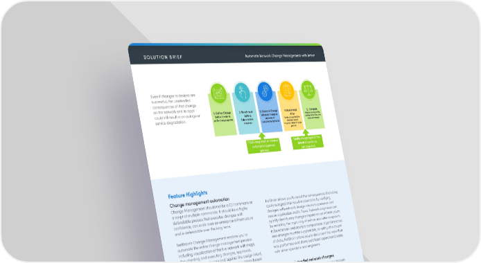 SOLUTION BRIEF Automate Network Change Management with Intent Even if changes to devices are successful, the unintended consequences of that change on the network and its apps could still result in an outage or service degradation. Feature Highlights Change management automation Change Management should not be a CLI command or NetBrain allows you to avoid the consequences (including a script of multiple commands. It should be a highly costly outages) that result in downtime by verifying defendable process that executes changes with changes with network design intents to preserve and confidence, can scale over an enterprise infrastructure assure application traffic flows. Network engineers can and is defendable over the long term. quickly identify any change’s impact on an infrastructure by enabling the capturing of before and after snapshots NetBrain’s Change Management enables you to to benchmark and analyze comparisons of performance. automate the entire change management process And changes must be supportable, so with just a couple including visualization of the live network with maps, of clicks, NetBrain allows you to document the work that documenting and executing changes, approvals, was performed and share additional operational notes verification of the change and against the design intent, with other operators and engineers. and resulting performance. By leveraging intent-based automation, NetBrain allows you to create and execute Rollback unintended network changes changes across your entire network while preserving the network’s design intentions. Engineers can formulate and Enforce design intentions for network device changes apply configuration changes by defining the Intents they and the resulting connectivity changes. want to achieve, including the desired benchmarks expected after making the change. And whether the change is executed correctly or incorrectly, it’s the application performance that matters, In addition, NetBrain integrates with third-party ticketing so NetBrain allows you to have your rollback process systems (e.g., ServiceNow) to trigger approvals for network locked and loaded, ready to execute — all at once, changes, linking the original service tickets directly to device by device or line by line - to quickly restore any NetBrain and updating the ticket as its status changes. previous configuration. Intent-based automatic change management verification Even with the best intentions, changes can have a ripple effect across the hybrid network which may be hard to predict unless carefully architected in the context of the entire infrastructure and precisely executed. Even the smallest of errant changes on a single component can wreak havoc on an enterprise and its applications.