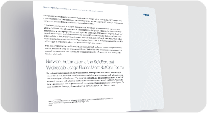 EMA White Paper | Operational Efficiency at Scale with Intent-Based, No-Code Network Automation Ž etwork teams waste too much time investigating alerts that are not actionable. s a † analyst with a private communications technology company told Š, “‘e don’t know which —alerts˜ to check out, so we have to check all of them to verify that they are false alarms.” IT leaders will be tempted to mitigate these problems by trying to hire more network engineers with advanced skillsets. The labor market will disappoint them. †nly „‚.“‰ of IT organi ations say it’s very easy to hire and retain people with network expertise, according to Š research. In particular, Žˆ‰ of organi ations say it is nearly impossible to find people with network security skills and Ž“‰ are strug- gling mightily to find people with network automation skills. lso, ‚™‰ say it is extremely hard to find ‡ experienced network troubleshooters. †rgani ations that succeed in hiring engineers with these skills will struggle to retain them, given the dynamics of today’s labor market. Šven if an IT organi ation can hire and retain skilled network engineers, fundamental problems will remain. €or instance, top-tier engineers will have a limited impact if network operations remain too manual. etwork teams need automation to reduce errors, drive efficiency, and proactively prevent trouble--all at scale. Network Automation is the Solution, but Widescale Usage Eludes Most NetOps Teams o-code network automation is an obvious solution for the problems that et†ps teams struggle with today. In fact, more than ˆ…‰ of network teams believe an enterprise network automation solu- tion can mitigate staffing issues.“ “The more you automate, the less human intervention is needed,” a network engineer with a €ortune “ƒƒ financial services company recently told Š. “›ou might have a gold standard that engineers created. It removes any typos and mistakes. †n the flipside, I’ve seen automation freeing up those engineers so they don’t have to track down an issue.” Ž Š, “etwork †bservabilityž Ÿelivering ctionable Insights to etwork †perations,” †ctober ‚ƒ‚‚. ‡ Š, “etwork anagement egatrends ‚ƒ‚‚,” pril ‚ƒ‚‚. “ I bid. . 2