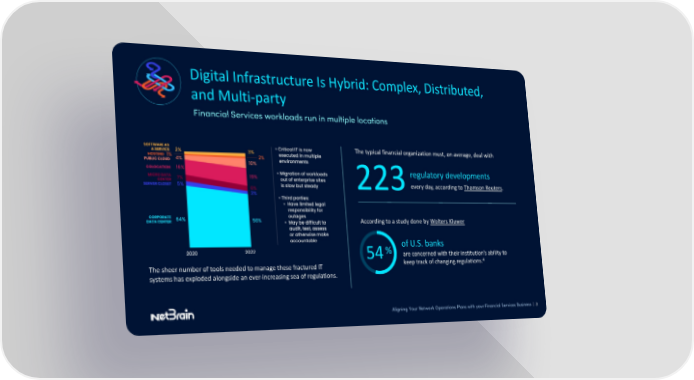 Digital Infrastructure Is Hybrid: Complex, Distributed, and Multi-party Financial Services workloads run in multiple locations The typical financial organization must, on average, deal with regulatory developments 223every day, according to Thomson Reuters. According to a study done by Wolters Kluwer % of U.S. banks 54 are concerned with their institution’s ability to The sheer number of tools needed to manage these fractured IT keep track of changing regulations.4 systems has exploded alongside an ever-increasing sea of regulations. Aligning Your Network Operations Plans with your Financial Services Business | 3