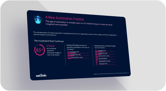 A New Automation Frontier The age of automation is already upon us. It’s transforming us in ways we never imagined were possible. The next-generation of network automation is helping financial services IT organizations prevent serious outages, performance degradations 6 and their impacts to the business. The Investment Push Continues of banks Banking LOB budget increases for Banking operations automation budget are increasing operations automation in the next 12- next 12-24 months 7 83% operations 24 months automation budget in next 12-24 months Aligning Your Network Operations Plans with your Financial Services Business | 5