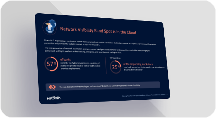Network Visibility Blind Spot is in the Cloud Financial IT organizations must adopt newer, more advanced automation capabilities that replace manual and repetitive processes with proactive prevention and provide the visibility needed to operate efficiently. The next-generation of network automation leverages human intelligence to scale faster and support the cloud while maintaining highly performant and highly available online banking, enterprise, and securities and trading services. of banks Yet fewer than 57% currently run hybrid environments consisting of of the responding institutions public and private cloud as well as traditional on- 25% have implemented tools to track and resolve disruptions to premises deployments. 3 this critical infrastructure. The rapid adoption of technologies, such as cloud, SD-WAN and SDN has fragmented data and visibility. Aligning Your Network Operations Plans with your Financial Services Business | 2