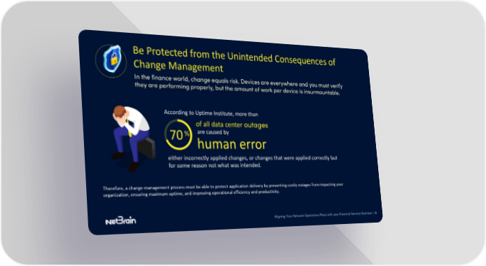 Be Protected from the Unintended Consequences of Change Management In the finance world, change equals risk. Devices are everywhere and you must verify they are performing properly, but the amount of work per device is insurmountable. According to Uptime Institute, more than of all data center outages 70% are caused by human error either incorrectly applied changes, or changes that were applied correctly but for some reason not what was intended. Therefore, a change management process must be able to protect application delivery by preventing costly outages from impacting your organization, ensuring maximum uptime, and improving operational efficiency and productivity. Aligning Your Network Operations Plans with your Financial Services Business | 8