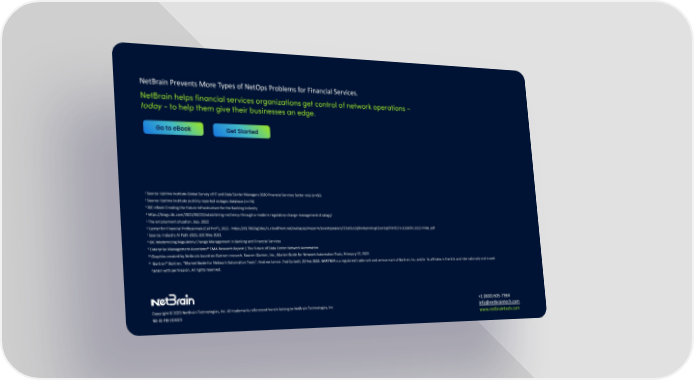 NetBrain Prevents More Types of NetOps Problems for Financial Services. NetBrain helps financial services organizations get control of network operations – today-to help them give their businesses an edge. 1 Source: Uptime Institute Global Survey of IT and Data Center Managers 2020 Financial Services Sector only (n=66) 2 Source: Uptime Institute publicly reported outages database (n=74) 3 IDC eBook Creating the Future Infrastructure for the Banking Industry 4 https://blogs.idc.com/2021/03/22/establishing-resiliency-through-a-modern-regulatory-change-management-strategy/ 5 The employment situation. Sep. 2022 6 Center for Financial Professionals (CeFPro®), 2022 - https://d17802kg5dey7s.cloudfront.net/webapps/mapcrm/eventspeakers/3l3o81o2q9kn4qmnhsq63sm3qt/FINTECH-LEADERS-2022-FINAL.pdf 7 Source: Industry Al Path-2021, JDC May 2021 8 IDC Modernizing Regulatory Change Management in Banking and Financial Services 9 Enterprise Management Associates® EMA Research Report | The Future of Data Center Network Automation 10 Graphics created by Netbrain based on Gartner research. Source: Gartner, Inc., Market Guide for Network Automation Tools, February 22, 2022. 11 Gartner® Gartner, “Market Guide for Network Automation Tools”, Andrew Lerner, Ted Corbett, 22 Feb 2022. GARTNER is a registered trademark and service mark of Gartner, Inc. and/or its affiliates in the U.S. and internationally and is used herein with permission. All rights reserved. +1 (800) 605-7964 Copyright © 2023 NetBrain Technologies, Inc. All trademarks referenced herein belong to NetBrain Technologies, Inc [email protected] NB-IG-FBI-013023 www.netbraintech.com