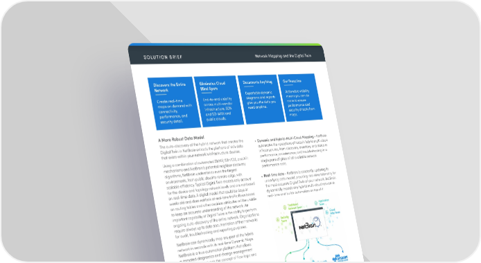 SOLUTION BRIEF Network Mapping and the Digital Twin Discovers the Entire Eliminates Cloud Documents Anything Get Proactive Network Blind Spots Exportable dynamic Actionable visibility Create real-time End-to-end visibility diagrams and reports means you can do maps on demand with across multi-vendor give you the data you more to ensure connectivity, infrastructure, SDN need anytime. performance and performance, and and SD-WAN and security directly from security detail. public clouds. maps. A More Robust Data Model The auto-discovery of the hybrid network that creates the • Dynamic and Hybrid-Multi-Cloud Mapping - NetBrain Digital Twin in NetBrain extracts the plethora of rich data automates the operations of today’s hybrid multi-cloud that exists within your network’s infrastructure devices. infrastructures, from discovery, inventory, and status to Using a combination of automated SNMP, SSH/CLI, and API performance, maintenance, and troubleshooting in a mechanisms and NetBrain’s patented neighbor discovery single pane of glass of all available network algorithms, NetBrain understands even the largest performance data. environments, from public cloud to remote edge, with • Real-time data - NetBrain is constantly updating its scalable efficiency. Typical Digital Twin models only account underlying data model, providing real-time telemetry for for the device and topology network levels and are not based the most accurate Digital Twin of your network. NetBrain on real-time data. A digital model that could be days or dynamically models any hybrid multi-cloud network in weeks old and does not look at real-time traffic flows based real-time and builds automation on top of it. on routing tables and other decision attributes will be unable to keep an accurate understanding of the network. An important capability of Digital Twins is the ability to perform ongoing auto-discovery of the entire network. Organizations require always up to date documentation of their networks for audit, troubleshooting and reporting purposes. NetBrain can dynamically map any part of the hybrid network in seconds with its real-time Dynamic Maps. NetBrain is a true automation platform that allows automated diagnostics and change management because it understands the concept of flow logic and intent-based management. • Multi-Layer Context – NetBrain enables you to discover, visualize and automate the operations of your hybrid- cloud services, automatically recording detailed device and connectivity information with full topological context from the device level to the intent level. Real- • Integrates 3rd-Party Data - NetBrain’s data model time contextual visibility and understanding enables the includes network management data via an open API full range of no-code network automation capabilities interface and specific out-of-the-box connectors built for found in NetBrain, assuring your hybrid infrastructure these tools, including Datadog and Splunk. More continues to deliver its design intentions. contextual information deepens your understanding of the network at-a-glance allowing you to act quickly. • Scalable - which is an architectural limitation and not easily overcome. The value of the digital twin is to enable scalable no-code automation. • Enables no-code network automation - This model understands business requirements and translates them into network intents which drives automation.