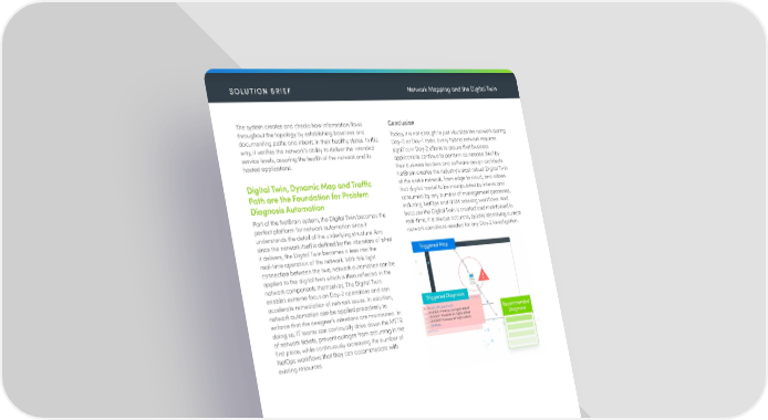 The ultimate benefit – Scale At the end of the day, IBA is scaling what network operations teams already do - collect and analyze data,investigate and diagnose network problems, and monitor and validate that the network is achieving the outcomes it has been built to achieve. By decoding infrastructure complexities to measure and validate the inner workings of the network’s services, IBA sets networkoperations on a path to automation that scales for every IT person, every network (no matter what it’s made of), and every task (no matter how complex). SOLUTION BRIEF Network Mapping and the Digital Twin The system creates and checks how information flows Conclusion throughout the topology by establishing baselines and Today, it is not enough to just visualize the network during documenting paths and intents in their healthy states. In this Day-0 or Day-1 tasks. Every hybrid network requires way, it verifies the network’s ability to deliver the intended significant Day-2 efforts to assure that business service levels, assuring the health of the network and its applications continue to perform as needed 24x7 by hosted applications. their business leaders and software design architects. NetBrain creates the industry’s most robust Digital Twin Digital Twin, Dynamic Map and Traffic of the entire network, from edge to cloud, and allows Path are the Foundation for Problem that digital model to be manipulated by intents and Diagnosis Automation consumed by any number of management processes, including NetOps and ITSM ticketing workflows. And Part of the NetBrain system, the Digital Twin becomes the because the Digital Twin is created and maintained in perfect platform for network automation since it real-time, it is always accurate, quickly identifying current understands the detail of the underlying structure. And network conditions needed for any Day-2 investigation. since the network itself is defined by the intentions of what it delivers, the Digital Twin becomes a lens into the real-time operation of the network. With this tight connection between the two, network automation can be applied to the digital twin which is then reflected in the network components themselves. The Digital Twin enables extreme focus on Day-2 operations and can accelerate remediation of network issues. In addition, network automation can be applied proactively to enforce that the designer’s intentions are maintained. In doing so, IT teams can continually drive down the MTTR of network tickets, prevent outages from occurring in the first place, while continuously increasing the number of NetOps workflows that they can accommodate with existing resources. About NetBrain Technologies Founded in 2004, NetBrain is the market leader for NetOps automation, providing network operators and engineers with dynamic visibility across their hybrid networks and low-code/no-code automation for key tasks across IT workflows. Today, more than 2,500 of the world’s largest enterprises and managed service providers use NetBrain to automate network problem diagnosis, generate real-time documentation, accelerate troubleshooting, and enforce enterprise architectural rules. +1 (800) 605-7964 Copyright © 2023 NetBrain Technologies, Inc. All trademarks referenced herein belong to NetBrain Technologies, Inc info@netbraintech.com NB-SB-NMATDT-031423 www.netbraintech.com