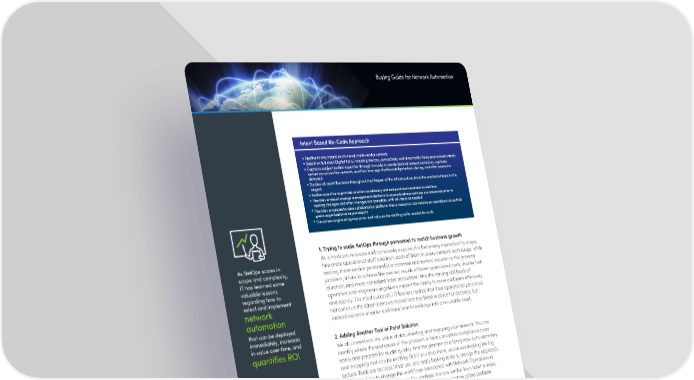 Buying Guide for Network Automation Intent Based No-Code Approach Applies to any hybrid multi-cloud, multi-vendor network Based on full stack Digital Twin, including devices, connectivity, real-time traffic flows and network intents Captures subject matter expertise through no-code to create desired network behaviors, replicate behaviors across the network, and then leverage that knowledge before, during, and after issues are detected Tackles all repetitive tasks throughout the lifespan of the infrastructure, from the smallest of tasks to the largest Scales expertise to provide solution consistency and reduced overhead and escalations Provides a robust change management platform to assure business services are preserved prior to making changes and after changes are complete, with roll-back as needed Provides a comprehensive collaboration platform where resources can resolve an operational issue that spans organizational responsibility Conserves engineering resources and reduces the staffing/skills needed for scale 1. Trying to scale NetOps through personnel to match business growth As infrastructure scope and complexity expand, it is becoming impractical to simply As NetOps scales in hire more operational staff and train each of them in every network technology. While scope and complexity, adding more service personnel is a common and tactical solution to this growing IT has learned some problem, it fails to achieve the desired results of lower operational costs, shorter task valuable lessons duration, and more consistent ticket resolutions. And the varying skill levels of regarding how to operators and engineers negatively impact the ability to solve problems effectively select and implement and rapidly. The most successful IT leaders realize that their operational plan must network not continue the labor-intensive model that has been in place for decades, but automation instead become smarter and transform knowledge into a re-usable asset. that can be deployed immediately, increases 2. Adding Another Tool or Point Solution in value over time, and We all understand the value of documenting and mapping your network. You can quantifies ROI identify where the root cause of the problem is faster, maintain compliance more easily and prepare for audits quickly. And the promise of a fancy new auto-discovery and mapping tool can be exciting. But if you stop there, you’re overlooking the big picture. Tools are tactical. What you are really looking to do is change the approach. You are looking to change the workflows associated with Network Operations to re-use knowledge and automate the portions that are similar from ticket to ticket. Buying just another tool does nothing to change the trajectory of the problem. 3. Waiting for AIOps and ML tools All AIOps and ML solutions take a black-box approach leveraging machine learning or traditional statistics-based AI functions to discover root causes from large amounts of machine data. But for most IT problems, a set of clean data is very hard to come by, on top of many other challenges including a PH. D to operate such a tool. Customers routinely state that AI and ML tools rarely meet the bar for success. These approaches are unaware of the infrastructure details and intents, so the observations they make are more theoretical or academic in nature. As such, they rarely produce results that have a material impact on the biggest challenge, which is solving a small number of similar problems at scale, using re-usable knowledge. And, since it's a really small number of similar problems, gaining the requisite knowledge is not really the NetOps scale issue. It automatically captures and applying automation to solve this set of problems again and again. When selecting a strategic network automation solution, look for solutions with the ability to apply knowledge and experience-based best practices proactively to prevent potential problems from impacting production.