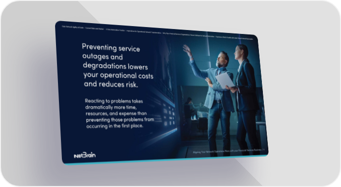 Gain Network Agility at Scale | Current State and Market | A New Automation Frontier | Imperatives for Operational Network Transformation | Why More Financial Services Organizations Choose NetBrain for Network Automation | Experience What’s Possible with Intent-Based Network Automation Preventing service outages and degradations lowers your operational costs and reduces risk. Reacting to problems takes dramatically more time, resources, and expense than preventing those problems from occurring in the first place. Aligning Your Network Operations Plans with your Financial Services Business | 1