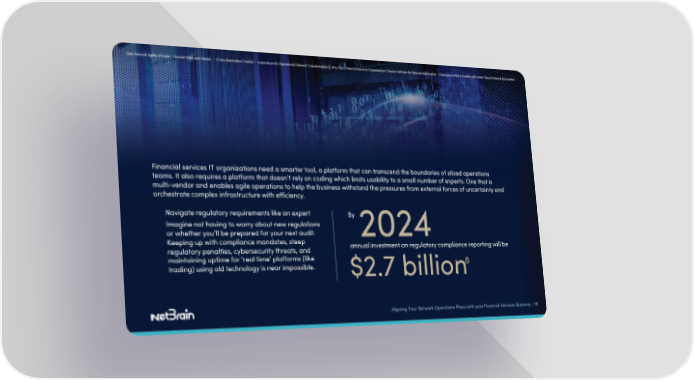 Gain Network Agility at Scale | Current State and Market | A New Automation Frontier | Imperatives for Operational Network Transformation | Why More Financial Services Organizations Choose NetBrain for Network Automation | Experience What’s Possible with Intent-Based Network Automation Financial services IT organizations need a smarter tool, a platform that can transcend the boundaries of siloed operations teams. It also requires a platform that doesn’t rely on coding which limits usability to a small number of experts. One that is multi-vendor and enables agile operations to help the business withstand the pressures from external forces of uncertainty and orchestrate complex infrastructure with efficiency. Navigate regulatory requirements like an expert By Imagine not having to worry about new regulations or whether you’ll be prepared for your next audit. 2024 Keeping up with compliance mandates, steep annual investment on regulatory compliance reporting will be regulatory penalties, cybersecurity threats, and maintaining uptime for ‘real time’ platforms (like 8 trading) using old technology is near impossible. $2.7 billion Aligning Your Network Operations Plans with your Financial Services Business | 11