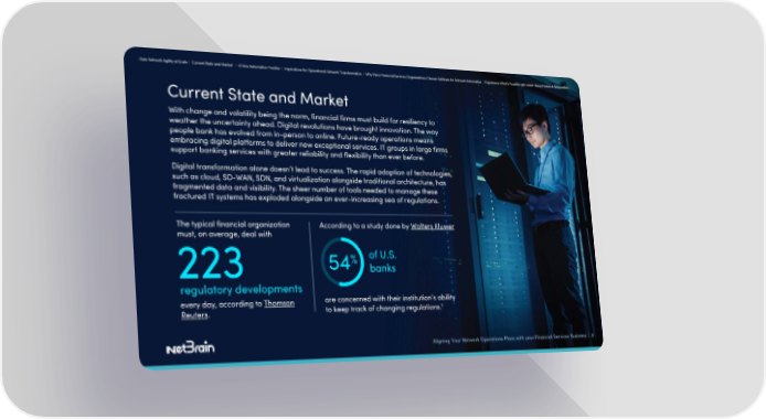 Gain Network Agility at Scale | Current State and Market | A New Automation Frontier | Imperatives for Operational Network Transformation | Why More Financial Services Organizations Choose NetBrain for Network Automation | Experience What’s Possible with Intent-Based Network Automation Current State and Market With change and volatility being the norm, financial firms must build for resiliency to weather the uncertainty ahead. Digital revolutions have brought innovation. The way people bank has evolved from in-person to online. Future-ready operations means embracing digital platforms to deliver new exceptional services. IT groups in large firms support banking services with greater reliability and flexibility than ever before. Digital transformation alone doesn’t lead to success. The rapid adoption of technologies, such as cloud, SD-WAN, SDN, and virtualization alongside traditional architecture, has fragmented data and visibility. The sheer number of tools needed to manage these fractured IT systems has exploded alongside an ever-increasing sea of regulations. The typical financial organization According to a study done by Wolters Kluwer must, on average, deal with % of U.S. 223 54 banks regulatory developments every day, according to Thomson are concerned with their institution’s ability 1 Reuters. to keep track of changing regulations. Aligning Your Network Operations Plans with your Financial Services Business | 3