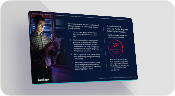 Gain Network Agility at Scale | Current State and Market | A New Automation Frontier | Imperatives for Operational Network Transformation | Why More Financial Services Organizations Choose NetBrain for Network Automation | Experience What’s Possible with Intent-Based Network Automation Network automation delivers a fundamentally Around the World, different approach to IT services at financial Financial Entities Regularly organizations by: Suffer Digital Outages... 1. Transforming legacy environments Significant/severe outages are that have stifled innovation for too not uncommon in finance long 2. Scaling faster without adding skilled personnel to develop and manage heavy-code technologies such as 32% Ansible which can script changes but won’t assist with problem diagnosis, Notable, serious mitigation, or prevention or severe 3. Reducing the risk of security breaches impact and maintaining configuration design compliance How would you classify the 4. Preventing serious outages and their most significant outage that business impacts thereby avoiding your organization has had in being front page news for preventing the past 3 years, either in your access to people’s money own site or a third-party provider site?6 Aligning Your Network Operations Plans with your Financial Services Business | 8