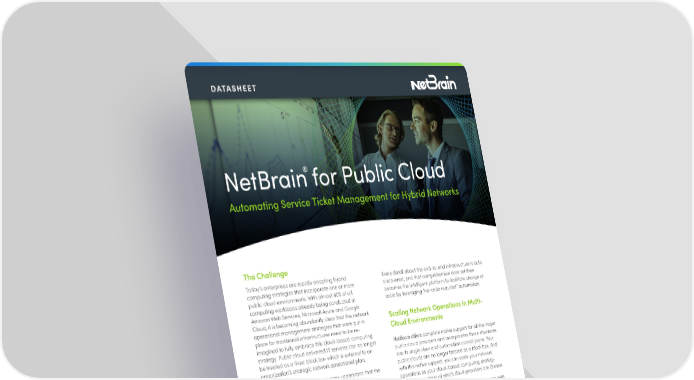 ® DATASHEET NetBrain for Public Cloud Microsoft Azure Discover Microsoft Azure public cloud resources, visualizing not only all Azure resources like VPN Gateway, ExpressRoute Gateway, VM but also topology and techniques like ExpressRoute Connection and Site-to-Site VPN used from on premises to Azure cloud. Google Cloud Discover Google Cloud public cloud resources, visualizing not only all Google Cloud resources like Cloud VPC, Cloud Router, VM but also topology and techniques like Partner Interconnect, Dedicated Interconnect and Site-to-Site VPN used from on premises to Google Cloud. Map Multi-Cloud Traffic Flows with NetBrain’s A/B Path Calculator When it comes to operational tasks like troubleshooting application slowness, operational teams must be able to discover the hop-by-hop path the application takes. NetBrain’s A/B Path Calculator performs this analysis automatically, all the way from the public cloud to the network edge. This enables true end-to-end path calculation in hybrid and multi-cloud environment - even if both ends are in the public cloud! Mapping a multi-cloud traffic path with NetBrain requires only the endpoints (via IP or hostname). Its path logic assesses many traffic-forwarding characteristics like Security Groups and ACL across subnets, VPCs/VNets, Network Virtualization Appliance like firewalls, data center to cloud private connectivity, and more. In addition, NetBrain uses self-designed algorithm to calculate the NCT Virtual Route Table for VGW, Direct Connect Gateway, etc., which is not in the route table on the cloud console but provides more connectivity information for users. About NetBrain Technologies Founded in 2004, NetBrain is the market leader for NetOps automation, providing network operators and engineers with dynamic visibility across their hybrid networks and low-code/no-code automation for key tasks across IT workflows. Today, more than 2,500 of the world’s largest enterprises and managed service providers use NetBrain to automate network problem diagnosis, generate real-time documentation, accelerate troubleshooting, and enforce enterprise architectural rules. +1 (800) 605-7964 [email protected] Copyright © 2022 NetBrain Technologies, Inc. All trademarks referenced herein belong to NetBrain Technologies, Inc www.netbraintech.com