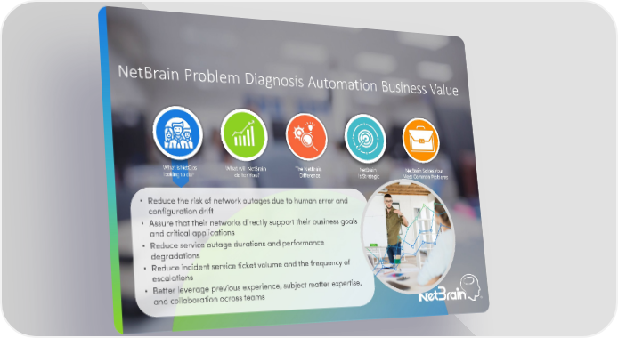 NetBrain Problem Diagnosis Automation Business Value WhatisNetOps What will NetBrain The NetBrain NetBrain NetBrain Solves Your lookingtodo? do for You? Difference is Strategic Most Common Problems • Reduce the risk of network outages due to human error and configuration drift • Assure that their networks directly support their business goals and critical applications • Reduce service outage durations and performance degradations • Reduce incident service ticket volume and the frequency of escalations • Better leverage previous experience, subject matter expertise, and collaboration across teams