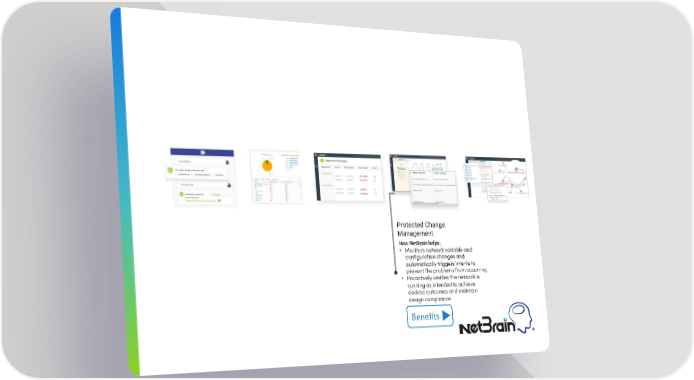 Protected Change Management How NetBrain helps Protected Change Management How NetBrain helps: • Monitors network variable and configuration changes and automatically triggers intents to prevent the problems from occurring • Proactively verifies the network is running as intended to achieve desired outcomes and maintain design compliance Benefits