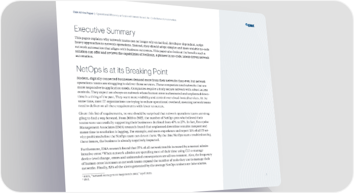 EMA White Paper | Operational Efficiency at Scale with Intent-Based, No-Code Network Automation Executive Summary This paper explains why network teams can no longer rely on tactical, developer-dependent, script- heavy approaches to network operations. Instead, they should adopt simpler and more scalable no-code network automation that aligns with business outcomes. This paper also looks at the benefits such a solution can offer and reviews the capabilities of etrain, a pioneer in no-code, intent-driven network automation. NetOps is at its Breaking Point odern, digitally connected businesses demand more from their networks than ever, but network operations teams are struggling to deliver those services. These companies need networks that are more responsive to application needs. ompanies reuire a truly secure network with robust access controls. They expect an always-on network where human error is eliminated and unplanned down- time is a thing of the past. They want more visibility and control over cloud-hosted services. t the same time, most IT organi ations are trying to reduce operational overhead, meaning network teams need to deliver on all these reuirements with fewer resources. iven this list of reuirements, no one should be surprised that network operations teams are strug- gling to find a way forward. €rom ‚ƒ„… to ‚ƒ‚‚, the number of et†ps pros who believed their teams were successfully supporting their businesses declined from ‡ˆ‰ to ‚ˆ‰. In fact, Šnterprise anagement ssociates ‹ŠŒ research found that unplanned downtime remains rampant and mean time to resolution is lagging. €or example, end users experience and report Ž„‰ of all IT ser- „ vice problems before the et†ps team can detect them. y the time et†ps starts troubleshooting these issues, the business is already negatively impacted. €urthermore, Š research found that ‚ˆ‰ of all network trouble is caused by a manual admin- ‚ istrative error. ‘hen network admins are spending most of their time using ’I to manage device-level change, errors and unintended conseuences are all too common. lso, the freuency of human error increases as network teams expand the number of tools they use to manage their networks. €inally, “މ of the alerts generated by the average et†ps toolsets are false alarms. „ Š, “etwork anagement egatrends ‚ƒ‚‚,” pril ‚ƒ‚‚. ‚ I bid. . 1
