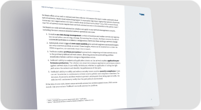 EMA White Paper | Operational Efficiency at Scale with Intent-Based, No-Code Network Automation etrain offers a true end-to-end and real-time solution with support for multi-vendor and multi-cloud hybrid networks. ulti-cloud networking support is especially important. Šighty-four percent of network „„ teams say their organi ations will have a multi-cloud architecture by ‚ƒ‚‡. lso, Š research found „‚ that ˆ…‰ of network teams reuire their network automation tools to be extensible to the public cloud. etrain’s no-code network automation solution can apply to any network management scenario, including the most common essential network operations use casesž „. It enables no-risk change management in which it baselines and verifies network and applica- tion intent before committing a change. y running these checks, etrain removes the risk of unintended problems or accidental configuration overwrites when making a network change. ‚. utomated, event-triggered root-cause analysis gives network engineers automated insights into why a network problem occurred. These insights, which can be inserted into a ticket via IT£ integration, can accelerate mean time to repair. Ž. etrain enables problem prevention by proactively comparing real-time network status to the previously defined network intents, detecting anomalies and enabling problem remediation before a network outage or degradation occurs. ‡. etrain’s ability to understand application intents on the network enables application per- formance protection. The solution can proactively compare application performance intents against network state. It can verify, for instance, whether an application is taking the right path across the network and identify the performance of that path. “. etrain’s ability to codify and enforce security intents enables security compliance. ¡sers can set the solution to continuously enforce security policies and compliance mandates. €or instance, if a security architect wants to prevent certain ports from being open to traffic, the solution will continuously verify that the port policy is maintained. If the idea of a no-code, intent-aware network automation solution appeals to you, Š recom- mends that you evaluate etrain’s network automation platform. „„ Š, “etwork anagement egatrends ‚ƒ‚‚,” pril ‚ƒ‚‚. „‚ Š, “The €uture of Ÿata enter etwork utomation,” €ebruary ‚ƒ‚‚. . 8