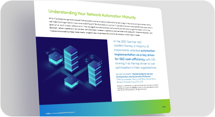 PAGE 4 NetBrain: Automating Problem Diagnosis Understanding Your Network Automation Maturity While IT professionals generally accept that automation can be a highly transformational technology, it may be surprising to realize that the vast majority of organizations have remained at “Level 0” (No Automation) since their IT operations function was created! These organizations ‘grew up’ on much simpler networks which they managed manually and, even as the world around them changed, the ways in which they approach network operations has not Even with the drastic increase in operational service tickets that comes with infrastructure growth, both in scale and complexity, these modernization projects have not yet become a priority But adoption is starting to increase In the 2021 Gartner I&O Leaders Survey, a majority of respondents selected automation implementation as a key driver for I&O cost-efficiency, with 23% ranking it as the top driver to cost optimization in their organizations. Source: Gartner®. “Market Guide for Service Orchestration and Automation Platforms”. Chris Saunderson, Manjunath Bhat, Daniel Betts, Hassan Ennaciri, August 10, 2021 Disclaimer: GARTNER is a registered trademark and service mark of Gartner, Inc and/or its affiliates in the U.S. and Internationally and is used herein with permission. All rights reserved.