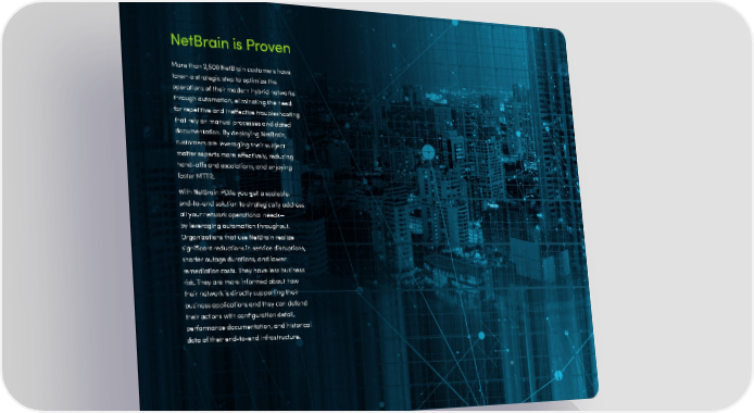 NetBrain is Proven More than 2,500 NetBrain customers have taken a strategic step to optimize the operations of their modern hybrid networks through automation, eliminating the need for repetitive and ineffective troubleshooting that rely on manual processes and dated documentation By deploying NetBrain, customers are leveraging their subject matter experts more effectively, reducing hand-offs and escalations, and enjoying faster MTTR With NetBrain PDAs you get a scalable, end-to-end solution to strategically address all your network operational needs— by leveraging automation throughout Organizations that use NetBrain realize significant reductions in service disruptions, shorter outage durations, and lower remediation costs They have less business risk They are more informed about how their network is directly supporting their business applications and they can defend their actions with configuration detail, performance documentation, and historical data of their end-to-end infrastructure