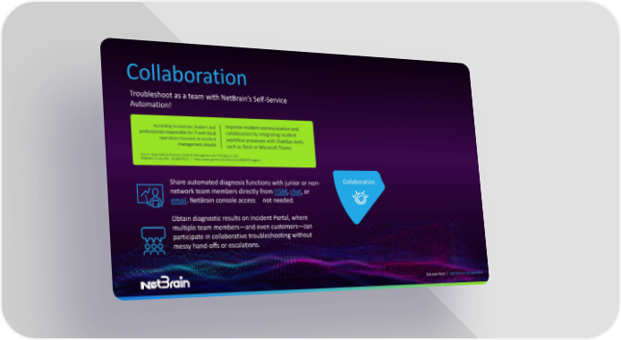 Collaboration Troubleshoot as a team with NetBrain’s Self-Service Automation! According to Gartner, leaders and Improve incident communication and professionals responsible for IT and cloud collaboration by integrating incident operations focused on incident workflow processes with ChatOps tools, management should: such as Slack or Microsoft Teams. Source: Hype Cycle for Business Continuity Management and IT Resilience, 2021 Published 12 July 2021 - ID G00747421 | https://www.gartner.com/document/4003437?toggle=1 Share automated diagnosis functions with junior or non- Collaboration network team members directly from ITSM, chat, or email. NetBrain console access not needed. Obtain diagnostic results on Incident Portal, where multiple team members—and even customers—can participate in collaborative troubleshooting without messy hand-offs or escalations. Solution Brief | Self-Service Automation