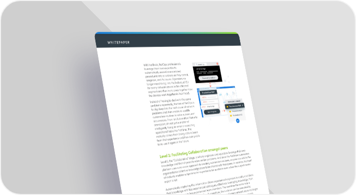 WHITEPAPER With NetBrain, NetOps professionals leverage their own expertise to automatically record standardized procedures into a runbook as they detect, diagnose, and fix issues. Operators no longer need to log into the individual CLI for every network device in the affected segment and then try to piece together how the devices work together in their head. Instead of having to deal with the same problems repeatedly, the task of NetOps is to dig deep into the root cause of network problems and then create re-usable automation routines to solve subsequent occurrences. From an Automation Maturity standpoint, it’s not just a matter of intelligently fixing an error or executing operational tasks the first time. The maturity comes from being able to learn from that experience and then being able to re-use it again in the future. Level 2: Facilitating Collaboration amongst peers Level 2, the “Collaborative” stage, is where engineers and operators leverage their own knowledge and that of peers to solve similar problems. And since the NetBrain automation platform uses a no-code approach to creating automation routines, anyone can add to the organization’s collective knowledge base to be shared with their peers. In essence, this level of maturity enables subject matter expertise to be available even when the subject matter expert is not. Automatically capturing this information allows experienced engineers to codify and share their knowledge with less experienced colleagues, effectively leveraging knowledge, from experienced users to less experienced team members. The next time the same task is needed, commonly referred to as Day-2 operations, the runbook can be executed by responders without the same level of experience. Even complicated network issues no longer need to be handled exclusively by experts. Level 2 automation maturity allows network operation teams to increase their collective knowledge, and share resources more effectively. It allows operational teams to act as a unified resource, rather than a loose collection of discrete experts. Level 3: Automatic response to external events Level 3 or “Triggered” network automation maturity occurs when organizations use network automation in response to external events, before operators and engineers get involved. Triggered automation enables any set of actions to be performed in response to external events, such as when tickets are created by an ITSM system. The Definitive Guide to Network Automation | 4