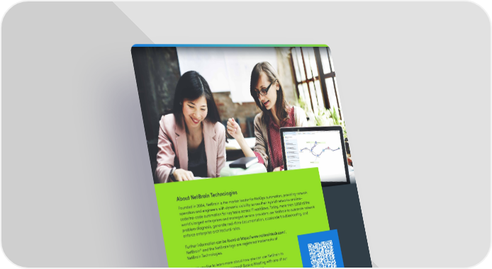 About NetBrain Technologies Founded in 2004, NetBrain is the market leader for NetOps automation, providing network operators and engineers with dynamic visibility across their hybrid networks and low- code/no-code automation for key tasks across IT workflows. Today, more than 2,500 of the world’s largest enterprises and managed service providers use NetBrain to automate network problem diagnosis, generate real-time documentation, accelerate troubleshooting, and enforce enterprise architectural rules. Further information can be found at https://www.netbraintech.com/. NetBrain® and the NetBrain logo are registered trademarks of NetBrain Technologies. Would you like to learn more about how you can use NetBrain to automate your NetOps processes? Book a Meeting with one of our solutions consultants for a custom-tailored demo. Or use this QR code to book the meeting +1 (800) 605-7964 info@netbraintech.com Copyright © 2022 NetBrain Technologies, Inc. All trademarks referenced herein belong to NetBrain Technologies, Inc www.netbraintech.com